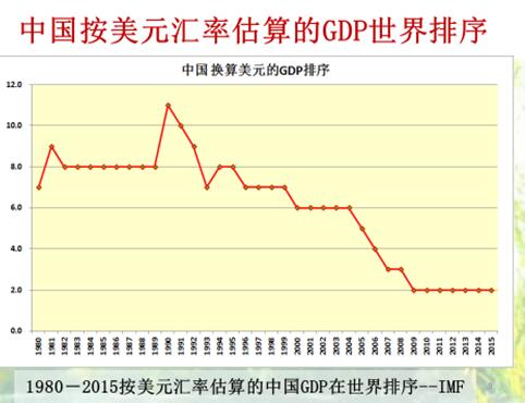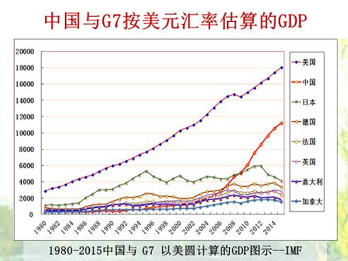 美元汇率计算GDP,下图是中国1980年以后中国与美元换算GDP,通过曲线可发现,中国GDP速度增长还不错。从1980年到2015年,GDP平均增长速率为10.84%,平均6.74年翻一番。