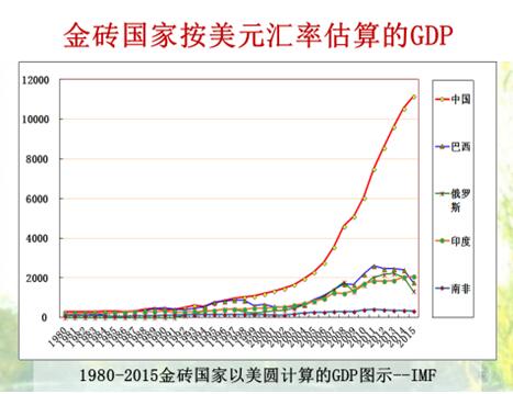 自1980年以来,中国GDP在全球排名最差排在第11,最好的是第二位。为什么1990年排在第11,因为那一年人民币贬值比较大。金砖国家按美元计算GDP,中国在1990年之前与金砖国家差异很小,2000年后就出现了明显的差别。