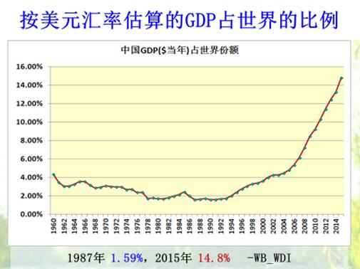 下图是中国与美国GDP占世界比例的变化情况,中国在1987年是1.59%,2015年14.8%,但仍然没有达到中国人口占世界人口的比例,人均GDP也没达到世界的平均水平。美国GDP占世界之比例,1960年39.8%,2011年21.4%,2015年24.4%。
