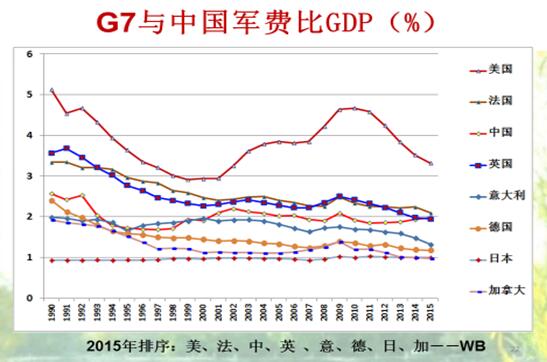 军费方面,是美国大约是六千多亿美元,中国是两千多亿美元。90年代初,中国军费占GDP的比例很低,93年的时候中国是日本的21.8%,日本的军费接近中国的5倍,而2015年军费是日本的5.25倍。GDP是个人消费、政府消费和国家消费的基础,没有GDP国防就不稳固。