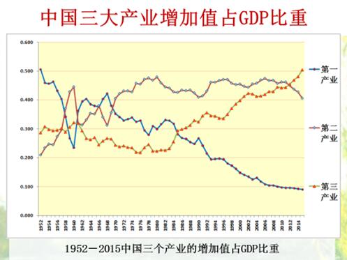 经济结构的比较。这是中国的三大产业增加值占GDP的比例,第一产业50%多到10%以下,第二产业好长时间位居第一,现在排名下来了。