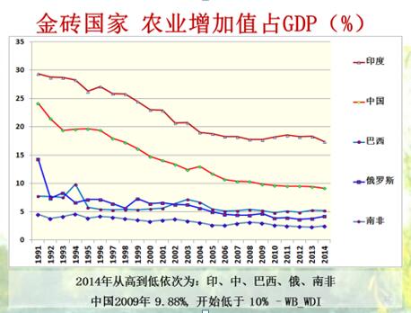 在金砖国家中,农业增加值占GDP比重,中国排在第二,印度比中国高,其他都比中国低。