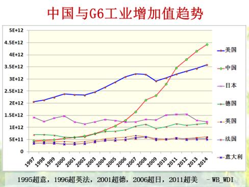 工业增加值占的GDP比重,金砖国家中国第一。与G6相比,也是最高的。下图是中国和G6工业增加趋势对比。