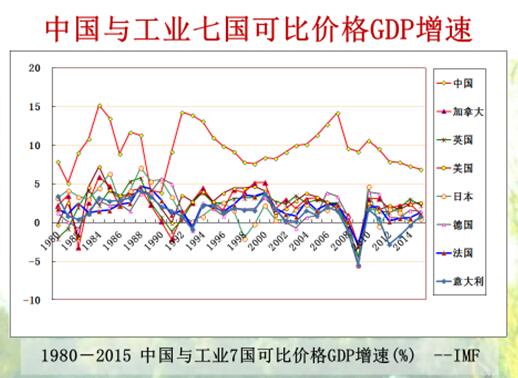 从1953年开始说增速可以看改革开放前后大不相同,改革开放后振幅小,改革开放之前振幅大,而且1961年是负增长。中国与工业七国可比价格GDP增速。