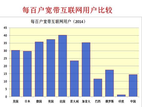 在每百户宽带互联网用户,比巴西强,比俄罗斯差一些,比发达国家要差一些。