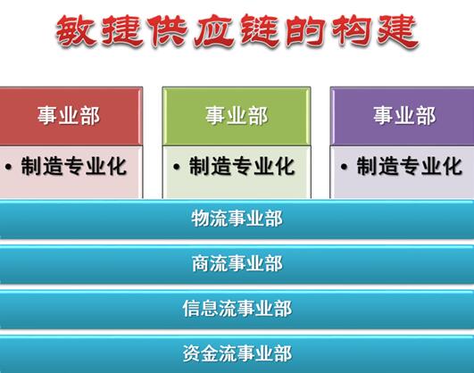 敏捷供应链构建应从两个步骤进行,首先是从企业内部,企业内部利用互联网改造企业组织。例如,1999年之前,海尔的每个制造事业部都有负责物流、信息、资金、商流的部门。1999年之后,海尔将物流、信息、资金、商流从每个制造事业部从独立出来,使事业部制造专业化,同时使物流、信息、资金、商流更好地为制造业服务,提高资源资源配置效率,这就是互联网的思维,如下图所示。