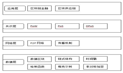 区块连基础架构主要包括四个层级,分别为应用层、共识层、网络层和数据层。其中应用层包括区块链金融和区块供应链,共识层包括PoW、PoS、DPoS等内容,网络层包括P2P网络和传输机制,数据层则包括数据区块、链式结构等6个方面的内容。如下图所示: