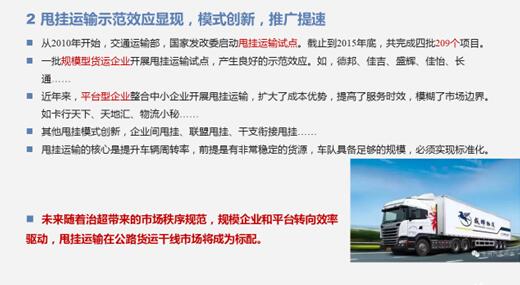 ②甩挂运输示范效应显现,模式创新,推广提速:未来随着治超带来的市场秩序规范,规模企业和平台转向效率驱动,甩挂运输在公路货运干线市场将成为标配。