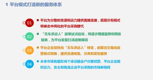 ①无车承运人试点启动:无车承运人试点对行业信息化水平提出了高标准,设置了高门槛,引导企业加大信息化投入,实现运输全程在线和透明化管理。