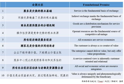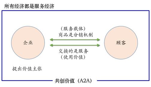 服务主导逻辑认为所有经济都是服务经济,企业不能传递价值,只能提出价值主张;交换的是服务,商品只是载体;价值创造转变为全员参与(A2A)。