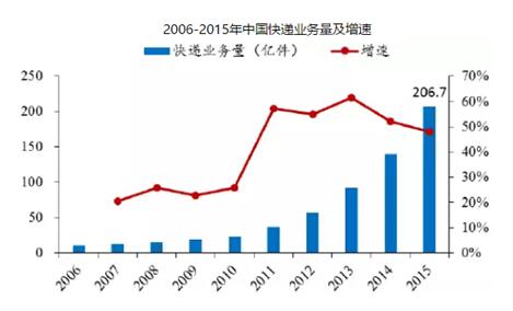 2015年我国快递业务量达206.7亿件,同比增长48%,最高日处理量达1.6亿件,占世界第一位。