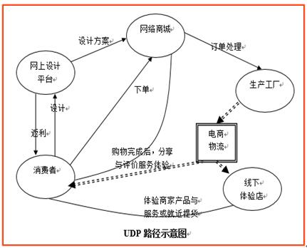 UDP模式即User Design Promotion,用户设计推广模式。这一模式很好地体现了O2O的线上与线下互动功能,充分地调动了消费者和其他供应链成员的参与。O2O企业可以把采购、设计、生产、销售、物流等环节中的一个或几个拿出来,设置合理的激励方式,使消费者、配送企业、体验店、网店等成员充分参与进来,最大程度发挥O2O的线上线下优势。