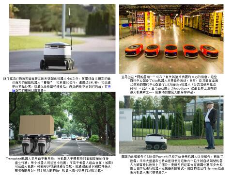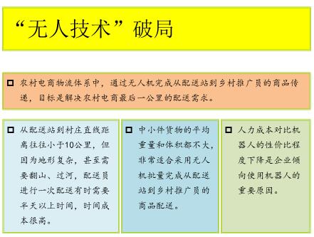 目前,国内外都非常重视无人技术的应用,无人技术的应用情况,分为“斗天派”和“斗地派”,“斗地派”代表,比如亚马逊、菜鸟和京东,研发的机器人贴地行走运货;“斗天派”代表,亚马逊、京东和Google。处于探索阶段的京东无人机,已经能够做到称重30公斤和航行50公里。Google的母公司Alphabet在弗吉尼亚理工大学校内开展了无人机配送外卖的项目测试。