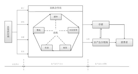 以农机合作社为核心企业的农业供应链,强调农机合作社在供应链中的服务类型和地位,从农业生产物资供应、农机合作社生产、农产品加工销售三个环节重新认识农业供应链。