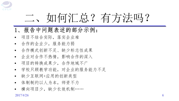这些问题可能覆盖面已经比较全了,但怎么汇总?什么是我们产学研的核心的问题呢?这就需要汇总的方法。我们面临的困难是只有37份报告讲到了问题,而且有的是一笔带过,没有对问题进行具体描述和展开分析。还有就是问题研究不够深入,只有19份报告不同程度的谈到了对问题的提炼和分析。更为普遍问题就是问题描述缺乏逻辑,问题与上下文的关联性不强。我前面论述了很多,是要说明问题是我们研究事物的核心。如果我们抓不住问题、取得共识,就无法打开产学研结合的新局面。如今,社会发展到了一个快速迭代的过程。发展不是慢蹭蹭,按部就班的发展,而是快速发展。所谓快速发展就是不断的试错,不断发现问题,解决问题,不断演进。起点、权利不重要,问题识别能力、纠正错误能力、演化改进能力最重要,这些是现在这个时代的特点。所以我们为什么强调问题导向,发现问题是一种能力。但是我们现在把问题是看作成一个习惯,一年的总结报告,觉得应该写几个问题,于是随便写几句。所以报告没有逻辑,非常自由、任性,缺乏上下文间的关联。从报告前面的叙述中,很难发现存在问题;从后面的对策来看,对策可能也不是根据这些问题所深思熟虑部署出来的,这就是我们总结报告现在面临的困境。当然不管怎么样,我认为这可能还是代表了我们现在对于产学研认知的一个水平,具有代表性。大家可能没有认真思考产学研究竟怎么回事,问题究竟在哪,下一步应该怎么走,问题识别能力相对缺乏。那么我们要把碎片化的信息进行汇总,得到一个结果。这就是要讲一个汇总的方法。