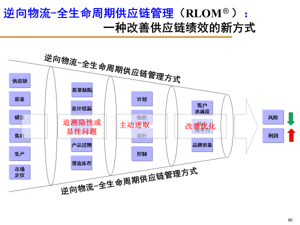 郝皓教授在分析传统的逆向物流管理方式的基础上,提出了逆向物流—全生命周期供应链体系。RLOM模型:主动式逆向物流管理就是以降低供应链风险,减少库存,提高产品利润率为核心,企业采取主动进取的逆向物流方式,追踪产品在其全生命周期过程中的显性或隐性问题,如质量缺陷、设计错漏、产品过期等,通过有效的计划、组织、运行、控制,改善优化企业的供应链管理、质量管理、研发管理、生产管理,从而达到树立企业品质形象、促进客户重复购买,降低总成本,强化核心竞争力的共同目标。