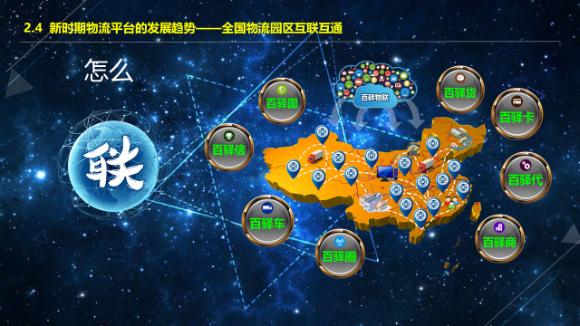 百驿网联什么?第一个是把专线联起来,把全国各地的区域型专线联起来。第二个是把金融联接起来,第三是把人联接起来,人是最重要的要素,“人心齐,泰山移”。联接人主要是在思想上要达到高度的认同,协同把事做好。同时把商业要素联、产业、货和车接起来,形成互联互通的供应链。