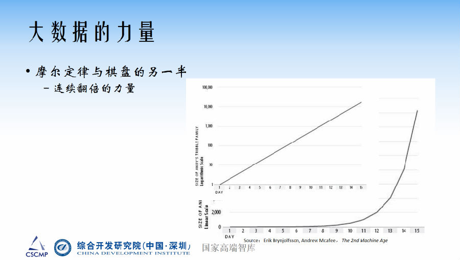 大数据的力量。现在大数据发展速度已经远远超了摩尔定律预测的阶段。我们现在用几何指数、一条曲线还能够描述棋盘翻倍的力量,现在大数据已经不能够用指数的方法描述,数据在以千倍的速度增长,而且还是45度的斜率,因此只能用对数的方法才能去描述数据的大小问题。