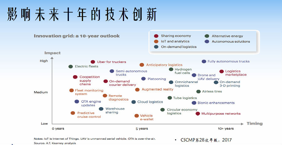 很多大公司都在预测什么是真正供应链领域的技颠覆性技术。我们发现应该是物联网、机器人和人工识别。美国供应链协会也发布了影响未来10年的关键技术,包括分享经济、物联网、基于需求的物流、可替代的能源、自主决策。