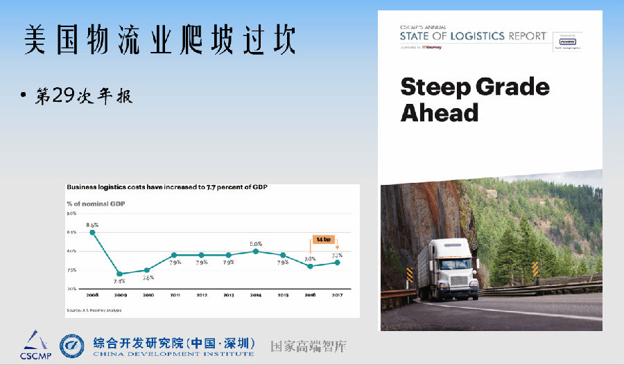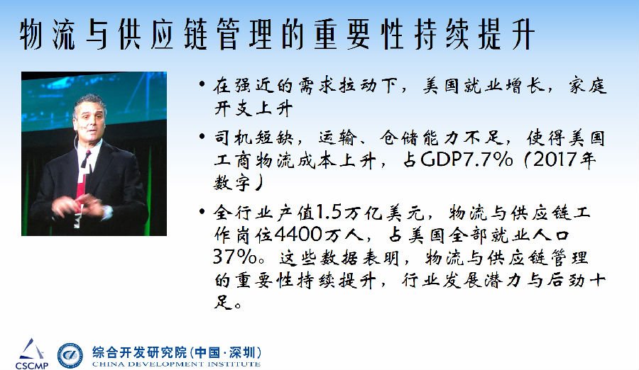 会议发布了最新的美国年度数据报告,美国物流成本大概在7.5%-8%之间徘徊。我们知道物流业就是经济的晴雨表,现在美国物流成本占GDP的比率上升0.1个百分点,他们认为是好的事情,是需求拉动和经济有活力的结果。