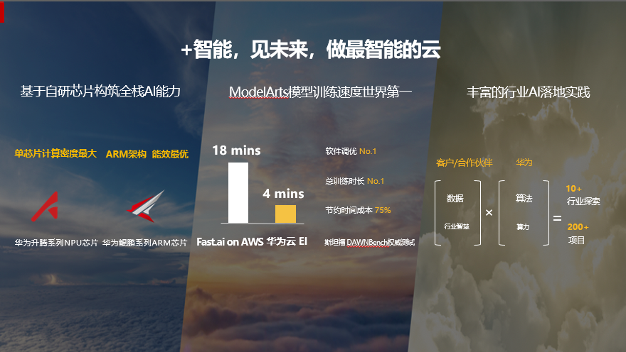 随着全行业向数字化、智能化转型,AI成为云服务竞争的焦点。在人工智能芯片方面,我们提供基于ARM架构的芯片,计算密度最大,能效最优。在人工智能开发平台方面,ModelArts模型在斯坦福DAWNBench权威测试中,软件调优、训练时长都达到了第一。AI要在行业落地,需要客户和合作伙伴提供数据和行业智慧,华为提供基础的算力和算法,只有这两点结合才能真正为企业带来价值。华为云已经在10多个行业、200个项目中,进行了AI行业落地的探索,这些落地实践将进一步完善华为云AI的产品和服务,不断提升竞争力。