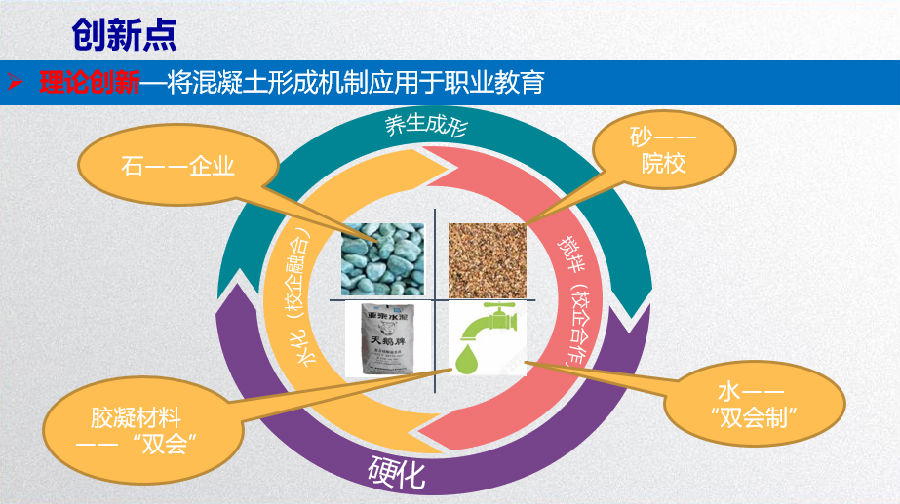 这种新模式有两个方面创新,一个是理论创新,将混凝土形成机制运用到职业教育中;二是路径创新,创新了职业教育人才培养“双会”路径,可以推广应用于所有的专业。