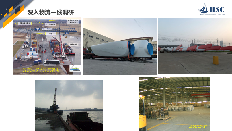 从2001年开始,我做了将近18年的研究,我自己的体会是无论从事物流教学还是研究,一定要深入物流一线调研。不深入企业调研,很多问题就会不知道。比如图上两个大的风电设备是怎么运输的?公路运输和海上运输是怎么进行周转的?图上右下角是专门找出来的2006年一个济南的发动机的回收,我当时研究逆向物流这块是发动机怎么回收。