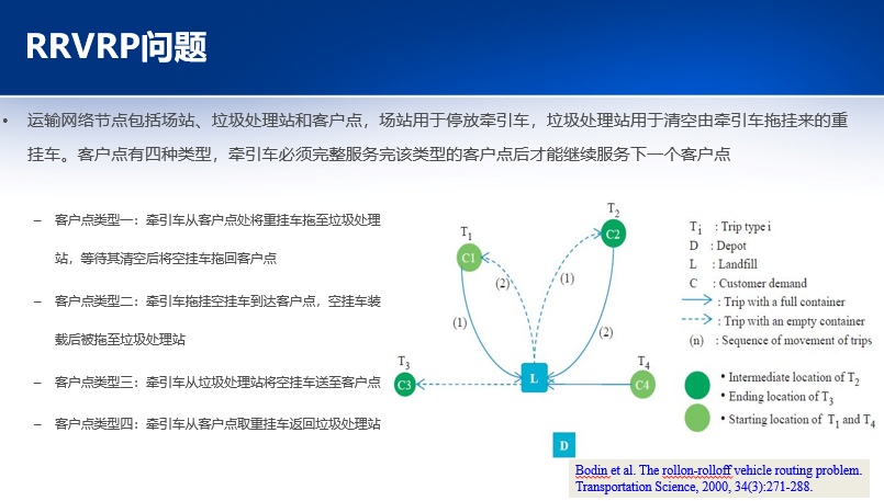 要想明白同行研究RRVRP问题的现状,需要找对应的英文,最后发现rollon-rolloff是对应的。这是2000年在Transportation Science期刊发表的关于研究RRVRP问题典型的文章,研究城市垃圾运输,运输网络节点包括场站、垃圾处理站和客户点。场站用于停放牵引车,垃圾处理站用于清空由牵引车拖挂来的重挂车。把客户点分为四种类型,把空箱和重箱运输放在一起提炼出问题。