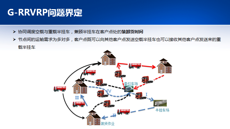 研究完RRVRP问题以后,开始研究协同调度空载与重载半挂车问题,还要兼顾半挂车在客户点处的装卸货时间。我举个例子,牵引车从牵引车厂出发,先去半挂车厂牵引空半挂车,然后去客户点装货运走,到目的地后可能再挂一个载货半挂车继续行驶,这个情景要考虑时间要求。