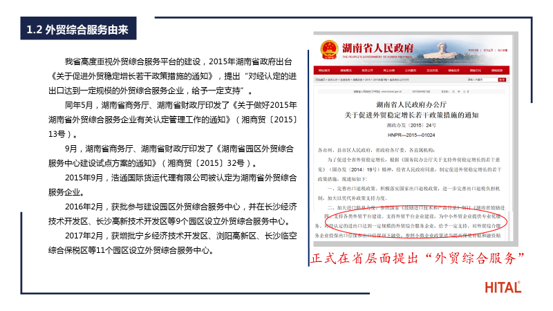 2013年7月24日,外贸国六条出台,正式在国家层面提出“外贸综合服务”。湖南省高度重视外贸综合服务,制定了一系列政策推动发展。