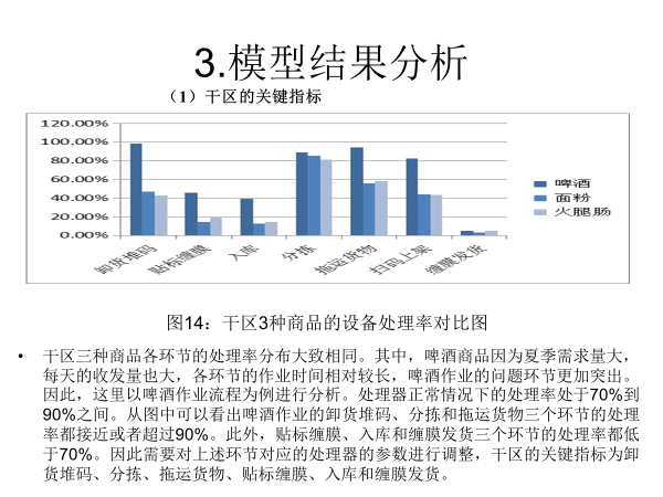干区三种商品各环节的处理率分布大致相同。其中,啤酒商品因为夏季需求量大,每天的收发量也大,各环节的作业时间相对较长,啤酒作业的问题环节更加突出。因此,这里以啤酒作业流程为例进行分析。处理器正常情况下的处理率处于70%到90%之间。从图中可以看出啤酒作业的卸货堆码、分拣和拖运货物三个环节的处理率都接近或者超过90%。此外,贴标缠膜、入库和缠膜发货三个环节的处理率都低于70%。因此需要对上述环节对应的处理器的参数进行调整,干区的关键指标为卸货堆码、分拣、拖运货物、贴标缠膜、入库和缠膜发货。