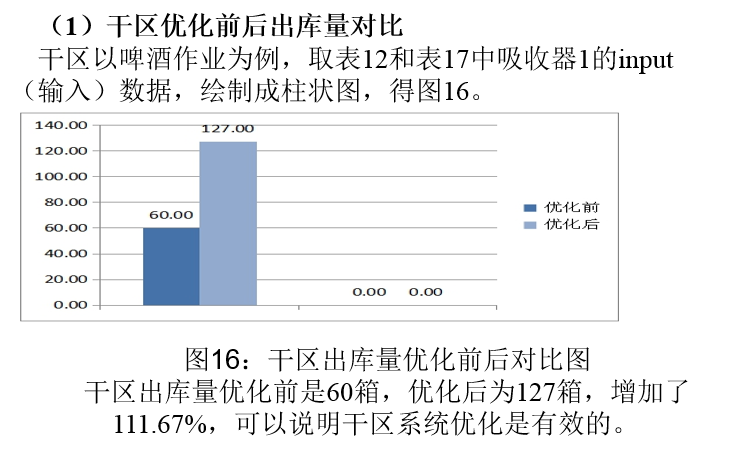 汪传雷主任根据仿真结果,调整了人员任务分配:修改前,卸货堆码环节有2名员工,加工时间为150s,修改后员工数增加了2人,变为4人。同样的工作,员工数增加为原来的2倍,时间将会减少为原来的一半75s。入库环节原来有4名工人,加工时间为60s,修改后加工时间增加到80s,员工数减少了1人,变为3人。拖运货物环节,原来有1名员工,加工时间为240s,修改后,加工时间为80s,员工数增加了2人,变为3人。扫码上架环节原来有1名员工,加工时间为210s,修改后,加工时间为70s,员工数增加了2人,变为3人。分拣环节原来有2名员工,加工时间为1200s,修改后,加工时间为600s,员工数增加了2人,变为4人。缠膜发货原来有8名员工,加工时间为75s,修改后,加工时间为600s,员工数减少了7人,变为1人。因此,调整前干区关键环节总共有18名员工,调整后有18名员工,总人数不变,调整不需要增加额外的人员工资成本。