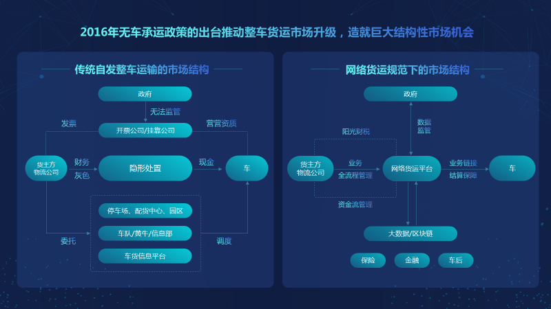 2016年无车承运政策的出台推动整车货运市场升级,造就巨大结构性市场机会。当下,物流行业已经从过去传统自发整车运输的市场结构过度到了网络货运规范下的市场结构。
