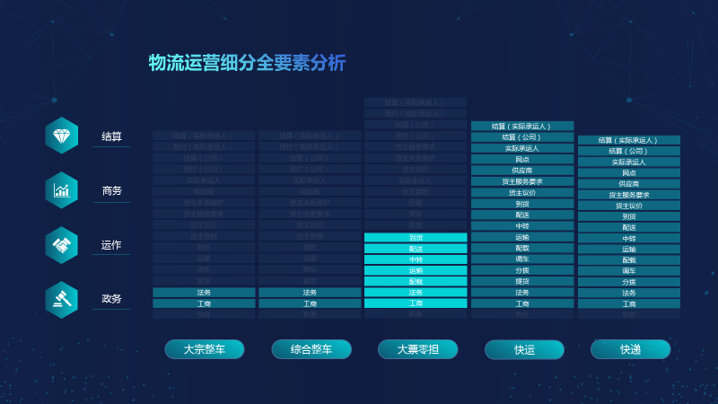 按照货体量的大小,物流行业一般可分为“大宗整车、综合整车、大票零担、快运”等类型,做物流企业一般必然要做政务、运作、商务、结算等事情。把物流分类和企业必然要做的事情做成一个二维轴,如下图所示。