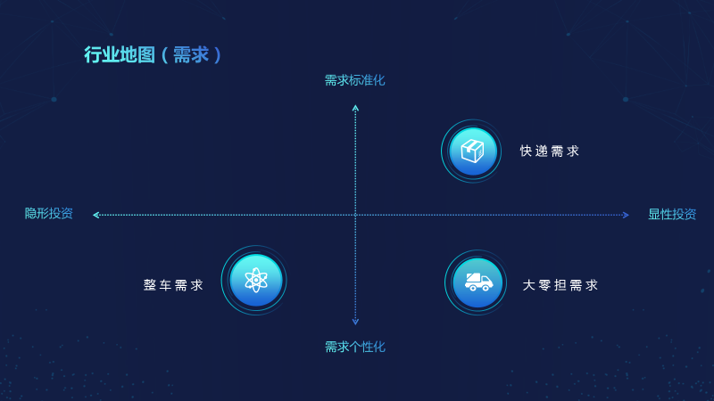 其中,纵轴向上是标准化服务,向下是个性化服务,从这可以发现,C端物流大多在标准化服务里,B端物流在个性化服务里。另外横轴向左是隐性投资,向右是显性投资,显性投入绝大多是可以进入到企业财务报表里的。把现实中的物流企业投射到这张行业地图中可以发现,快递、整车、大票零担等都在不同的象限,可以找到各自的位置。我们的快递除了需求驱动以外,与输出标准化以及重资产投入能够推动标准化发展是相关的,这两者是相互匹配的。第三象限,项目物流做不大,是因为它服务的是B端个性化需求。最重要的个性化实际上不是运作,在于商务,例如要单独定价、要给客户提供账期结算、还有很多个人关系等。这些东西不能标准化运作,也导致项目物流公司的重资产投入不是很有效。所以,有很多小公司在做项目物流。当然,项目物流也有一些大公司,但打开来看,做的其实还是项目化管理。另外,第四象限是大票零担,因为它既需要为客户做B端的个性化服务,又需要一定的资产投入,这是大票零担。想在这个领域做大、形成规模化,是非常难的,现在很多企业依然在做探索。