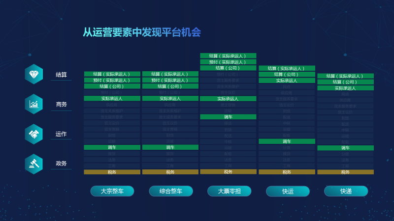 其次,如何从运营要素中发现平台机会?作为一个运力平台,能够输出什么样的标准化服务,是最关键的内容。但这个内容该如何去找呢?我们再回过头来看一下这个运营要素分析图。
