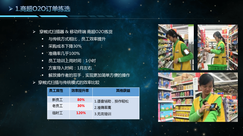 结合上述痛点及问题,浩创科技与某知名商超连锁企业合作,创造性的开发出“穿戴式扫描+语音识别辅助”解决方案,经过在上海、深圳若干家店面经过9个月时间的方案设计、开发测试、试运营,完成了项目POC,取得了超出预期的效果,下一步将进入批量推广复制阶段。主要如下: