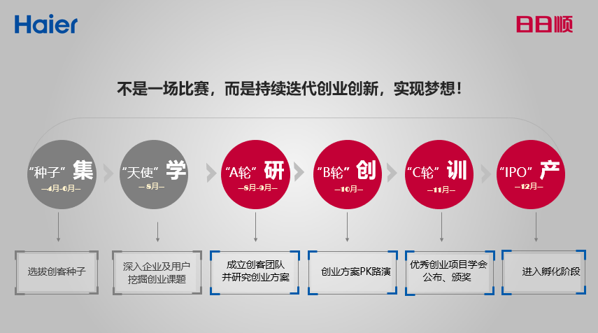 日日顺物流创客训练营不是一场比赛,而是持续迭代创业创新,实现梦想。共有6个环节,分别是“种子”集、“天使”学、“A轮”研、“B轮”创、“C轮”训和“IPO”产。