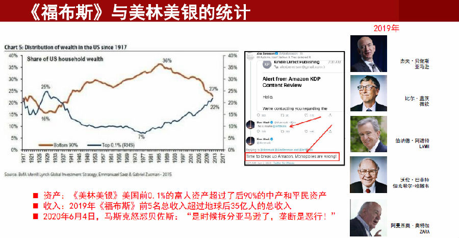 2013年全球最大的金融机构之一——美银美林(Bank of America MerrillLynch)对美国国民资产有一个较为长期的统计。从其对美国国民资产分布统计报表来看,从2013年开始,美国前0.1%首富的资产就开始超过了美国后90%的资产,并逐年升高;而全球更乐于关注的《福布斯》全球富豪排行榜在2015年统计中,前67名富豪的年收入总和超过了地球后35亿人的收入总和;仅一年之隔,2016年就变成前8名富豪的年收入总和超过了地球后36亿人的年收入总和,2018年更缩减为前5名富豪的年收入总和超过地球后37亿人的年收入总和。2019年,因为首富贝佐斯离婚了,使得依然是前5名富豪的年收入总和超过地球后38亿人的年收入总和;不然,前4名富豪就能达成这个目标。有人预测可能到2026年,如果亚马逊不被拆分的话,贝佐斯一个人的年收入将超过地球后40亿人年收入总和的概率将超过90%。