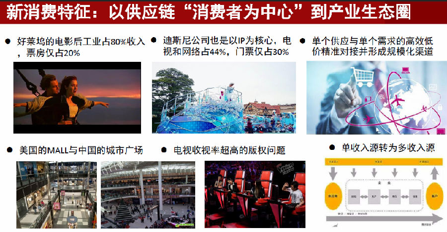 左上图是电影《泰坦尼克号》,1997年拍摄,20多年过去了,但每年其中女主人公的海洋之心项链仿制品的销售量就达到2000万个,实际上,好莱坞的电影后工业收入占比高达80%;第二张图片是迪士尼乐园中《冰雪奇缘》场景巡演车,2013年出品的《冰雪奇缘》也是迪士尼乐园创造最成功的IP之一,其主人公艾莎公主的公主裙等周边产品已经为迪士尼带来了近300亿美元的收益,而迪士尼乐园的门票仅占其总收入的30%;第三张图片可以看到,近年来,产业地产代替了住宅地产,各地兴起了各种城市广场,其带火了位于其中的餐饮业和儿童娱乐业,但其运营模式均来自于上个世纪50-60年代兴起的MALL;最后的图片是电视综艺栏目《中国好声音》,与《非诚勿扰》《爸爸去哪儿》等一系列火爆综艺栏目的版权均购自海外。这四个案例让我们充分认识到我们对消费者需求理解与西方发达国家的差距,当然,我们只有到1996年才开始体会到供大于求,但2002年加入WTO又让中国制造体会到无限市场的需要,消费者的需求又被忽略了,只有到了2008年中国又开始面临产能过剩,这样才开始系统思考满足消费者的方法,而欧美国家数百年的市场体制对消费者的理解值得我们持续的学习。