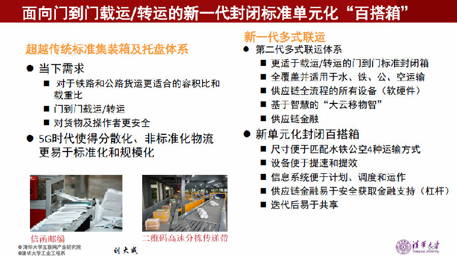 第三是将已经成功运行60多年的20英尺标准集装箱体系进行创新升级,构建第二代多式联运体系。以往中国多式联运比例过低也是由于中国公路货运行业集中度低至1.2%,导致“小散乱差”且以超低价竞争为主,而标准集装箱是为水运而设计,但往往造成有时近1/3的空闲空间,即容积比和载重比造成的高成本并不适合中国对成本斤斤计较的公路货运和铁路货运,且水运标箱对偏载约束不高,但铁运标箱则因为行车安全考虑对偏载有严格要求,所以标准集装箱亟待改进。