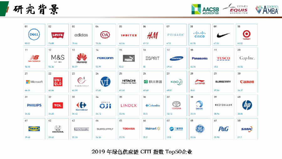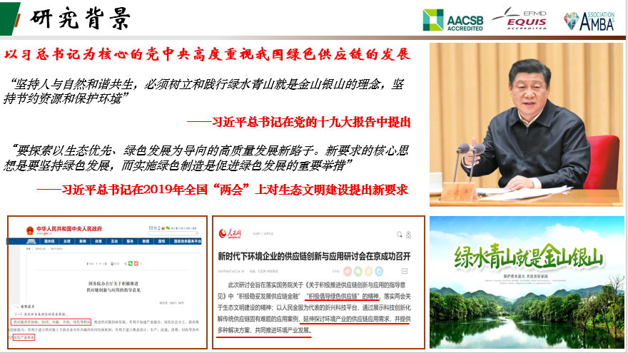 大家都知道,以习近平总书记为核心的党中央非常重视我们国家的绿色发展,尤其是绿色供应链的发展。在党的十九大报告中,习近平总书记明确提出“绿水青山”就是“金山银山”的重要理念,这为我们的研究提供了重要的线索。在2019年的全国“两会”上,习近平总书记对生态文明建设提出新的要求,要更加坚定地走绿色发展之路,实施绿色制造。在此之后,我们国家的各级政府相应出台有关环保政策和绿色创新政策等。绿色供应链作为实现绿色发展的重要举措,受到了大家的关注。在实施绿色发展的过程中,我国企业也积极践行绿色供应链管理。然而,与十几年前所不同的是,我国内外部环境有了很大的改变。第一个改变,就是外部政策法规的壁垒,从国际视野来看,我国出口产品涉及数千种,目前已有167个国家采取了绿色贸易壁垒的措施,这是和十年前很不一样的。第二个改变,是国内外市场对绿色产品的偏好逐渐增强,我国消费者越来越重视绿色产品,对产品的绿色设计关注度增强。第三个改变,企业逐渐认识到通过绿色供应链管理,可以实现资源的可持续与有效配置。很多企业在一些包装和易耗品方面进行可循环设计,进行成本节约,从内部来讲企业也是想去绿色实践的。第四个改变,企业通过追逐绿色供应链管理的模式,在一定程度上不仅可以提高社会效益,还能够起到一定的经济效益。在这里我想说明一个问题,对于如何在新的内外部环境下实现这种社会效益和经济效益的机制,并没有得到精确的研究,他们的促进程度如何?机制如何作用?都还没有一个清晰系统的分析,这也正是我们研究的重点。大家可以看到2019年公众环境研究中心发布的绿色供应链CITI指数排名前50的企业,中国仅有5家企业在榜。我们可以清楚地看到50名均为知名企业,可以理解为从事绿色供应链管理的这些企业拥有更好的品牌,这些更好的品牌能为这些企业带来更多经济效益。但另一方面,虽然能为企业带来经济效益,在实施绿色供应链时也会面临很多成本压力。那么当前环境中,我们企业会不会因为成本影响相关实践措施?其实这也是我们研究中要回答的问题。