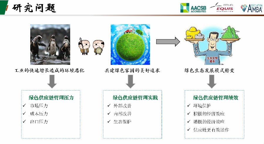 同时,我们也要考虑企业内部、市场运作机制、环境保护意识和企业经济效益之间的关系。近几年市场需求快速变化,企业需要提高快速响应市场的能力。因此,我们希望能够验证绿色供应链管理实践创新方法和手段以及快速响应技术的调节效应,探索一下这些技术会不会起到调节作用。总体而言,我们企业面临很多压力,这些企业的实践压力会不会影响到企业进行绿色供应链管理实践?中国的绿色供应链企业实践会不会给企业经营带来更多的优势?很多企业认为绿色设计、采购、生产和销售这些供应链管理实践本身就是一个伪命题,为什么?因为它涉及到成本投入,成本投入后能否带来很好的品牌效益?会不会出现我们想要得到的诸如减少物流损耗、标准化循环使用、可以节省材料等等的这些优势。这些是我们亟待需要回答和解决的问题。