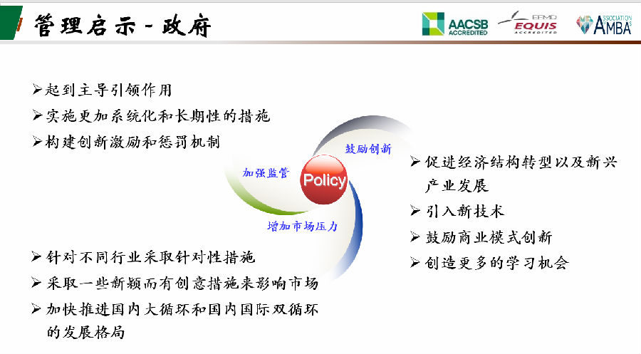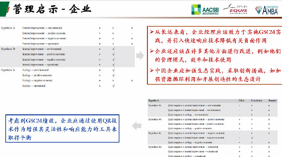 (3)企业应该加强生态实践,采取创新措施,比如如何进行创新生态设计、循环经济利用?这是我国企业需要考虑的,特别是要考虑绿色供应链绩效,企业应该通过快速响应技术来增强企业灵活性和响应性能力,取得一些平衡。
