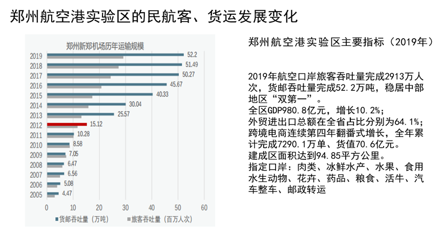 郑州航空港试验区是在河南省率先提出中部崛起民航先行的战略构想之下,向国家申报的第一批国家级航空经济实验区,它的发展历程有三个节点:一是2013年被国务院批准为第一个国家级航空港经济实验区;二是2017年习近平总书记在河南提出建立空中丝绸之路,以郑州和卢森堡为两个端点建立空中丝绸之路,郑州航空港实验区就是空中丝路国家战略的重要承载器;三是2019年郑州航空港物流枢纽实施方案获批,也是我国第一个空港型的国家物流枢纽。