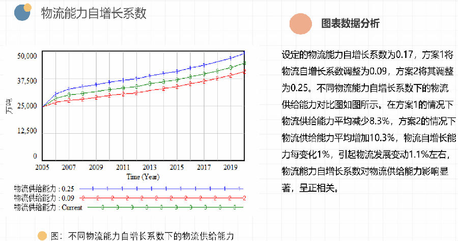 同时,物流行业由于宁波市的区位优势,特别是港口区位优势,它的经济发展水平与物流之间呈现出很大的相关性。下图显示的是物流能力自增长系数,如果设定物流能力自增长系数为0.17,方案一将物流自增长系数调整为0.09,方案二将其调整为0.25,不同的物流能力自增长系数下的物流供给能力就会呈现一些变化。在方案一的情况下,物流供给能力平均减少8.3%,方案二的情况下物流供给能力平均增加10.3%,物流自增长能力每变化1%,意味着引起的物流发展的变化值为1.10%左右,物流能力自增长系数对物流供给能力的影响显著,呈现正相关。