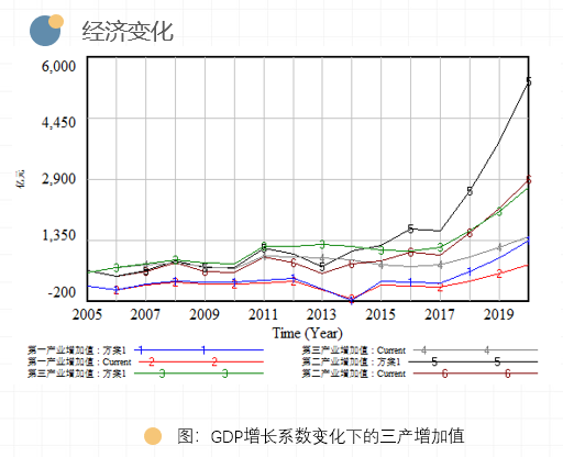 方案一将GDP增长系数调整,三产增加值的变化如下图所示。由图可知,宁波市第二、第三产业占比相近,第一产业占比较低,这与宁波市目前产业结构情况相符。经济变化对第二产业增加值影响最大,对第三产业增加值影响较大但增长趋势较第二产业平缓,这与全市的经济工作重点和政策导向不断向服务业倾斜的产业结构发展方向不符。经济发展与物流供给和物流需求呈正相关。