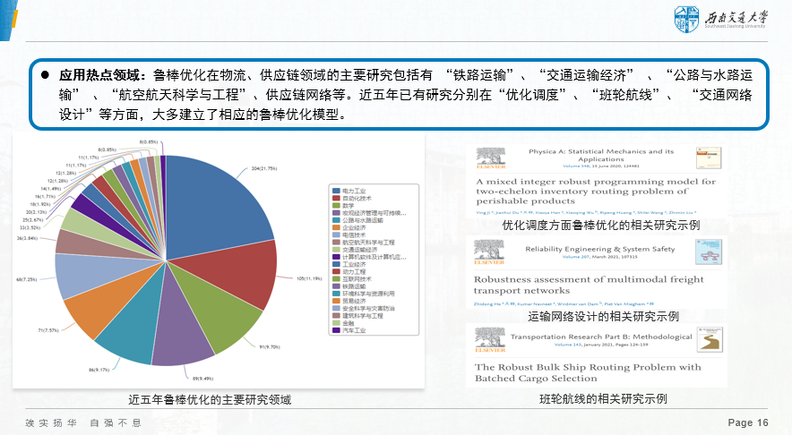 在鲁棒优化中,需求的概率分布函数是未知的,我们对于不确定性的刻画,使用概率分布函数的情况比较多,当然也可以采用很多诸如模糊集等其它手段。常见的有盒式不确定集、椭球不确定集、多面体不确定集、基数/预算不确定集、数据驱动不确定集等等。当前,鲁棒优化在物流、供应链领域的应用研究主要涉及“铁路运输”、“交通运输经济” 、“公路与水路运输” 、“航空航天科学与工程”、“供应链网络”等等。特别是近五年已有研究分别在“优化调度”、“班轮航线”、 “交通运输网络设计”等方面,有很多学者已经建立了相应的鲁棒优化模型。下图是我们查到的近五年文献分布情况和典型代表作情况。