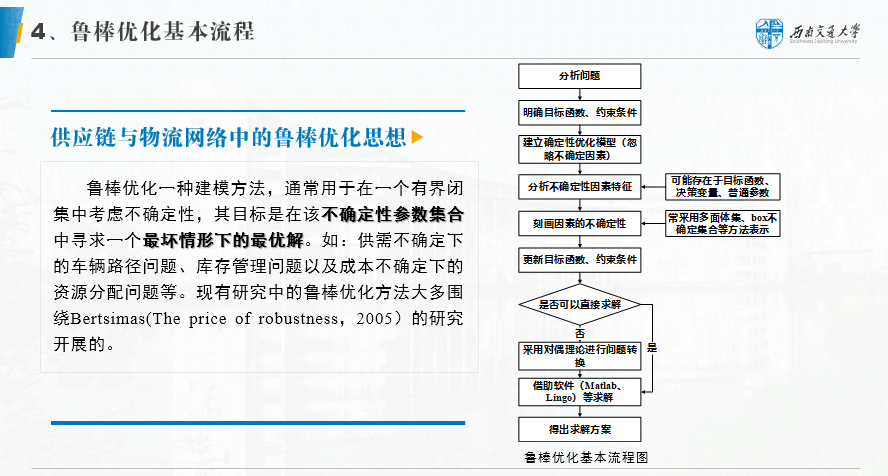 我来举一个示例,如不确定环境下应急救援供应链网络的鲁棒优化模型。我们各方面没有不确定或者其他因素的时候,我们的目标函数是比较明确的。这个网络优化问题的目标函数可以由救援配送中心建设或者租用成本、选址成本、救援产品从供应商到救援配送中的运输成本、以及救援中心到灾区的运输和配送成本来构成,同时要考虑到受灾区域的缺货损失。当然这部分成本确定起来比较复杂。但总体上讲,整个目标函数是使得所有成本最小,所以是一个最优化的问题。这里,最优化问题的约束条件也是比较清楚,每个约束条件的边界和定义都是可以准确地给出,决策变量的定义也是清楚的。但是,如果是不确定型应急救援供应链优化问题呢,就会使得目标和约束条件中,与需求有关的变量描述要发生变化,因此相应的函数、约束条件公式表达也要进行更新。比如需求的取值范围,我们采用多面体集法量化需求集,就是一个新的界定量。这个时候每一种救援产品的需求约束发生变化,每个受灾区域满足需求的最小百分比的界定发生变化。因此使得这个模型与我们传统确定型的供应链网络优化问题不同。当然对应的求解方法也发生一些变化,我们一般采用对偶转换,或者是借鉴现有的启发式算法来做一些改进,寻求鲁棒优化下的最优解。