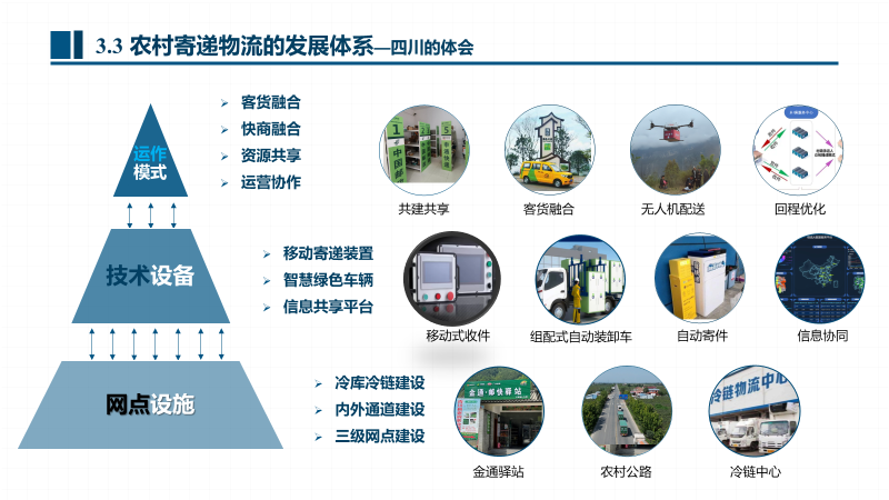 我们在研究四川农村地区的寄递物流时,根据省情、市情,明确了建设“体系、服务、技术”三个维度的高质量农村寄递物流的总目标,提出:体系要完善,表现是网点健全;服务要优质,表现是村村畅通;技术要先进,表现是智慧绿色。每个维度都有细分的内容与指标。目前在四川省的示范县市中存有三种模式,第一种模式是客货融合,主要切入运力组织创新上。通过实际场景图片以及示范方案可以看出,该模式依托村村通路网和金通工程车辆,通过运输监管优化、车辆路径规划、作业流程优化、订单拆分等技术应用,来提供客带货、货车班线等服务。第二种模式是平台资源整合,主要切入电商和农村寄递物流融合。这里显示的是四川甘孜州某县的示范项目。该模式依托村村通路网和金通工程车辆、农村配送专车,通过电商物流平台开发、配送中心与网点构建、车辆路径规划、三代业务培育等关键技术应用,来提供客带货、货车班线、网购快递等综合服务。第三种模式是交商游融合,主要切入农村寄递物流的车辆、快递业务、订单信息、商邮等,目前全省第一批有十个示范县市区。该模式将依托县乡村三级网点和金通工程车辆、农村配送专车,通过动态网点构建、组配式车辆研发应用、移动寄递系统研发应用、寄递资源(订单、运力、网点)共享等关键技术创新,提供即时寄递服务、电商销售、直播带货等综合服务。这个示范是要从理念、技术以及服务模式等方面做多方面的创新和改革,当然改革创新还存在不少阻力与困难,但总是要尝试才能知道合适与否、可行与否。